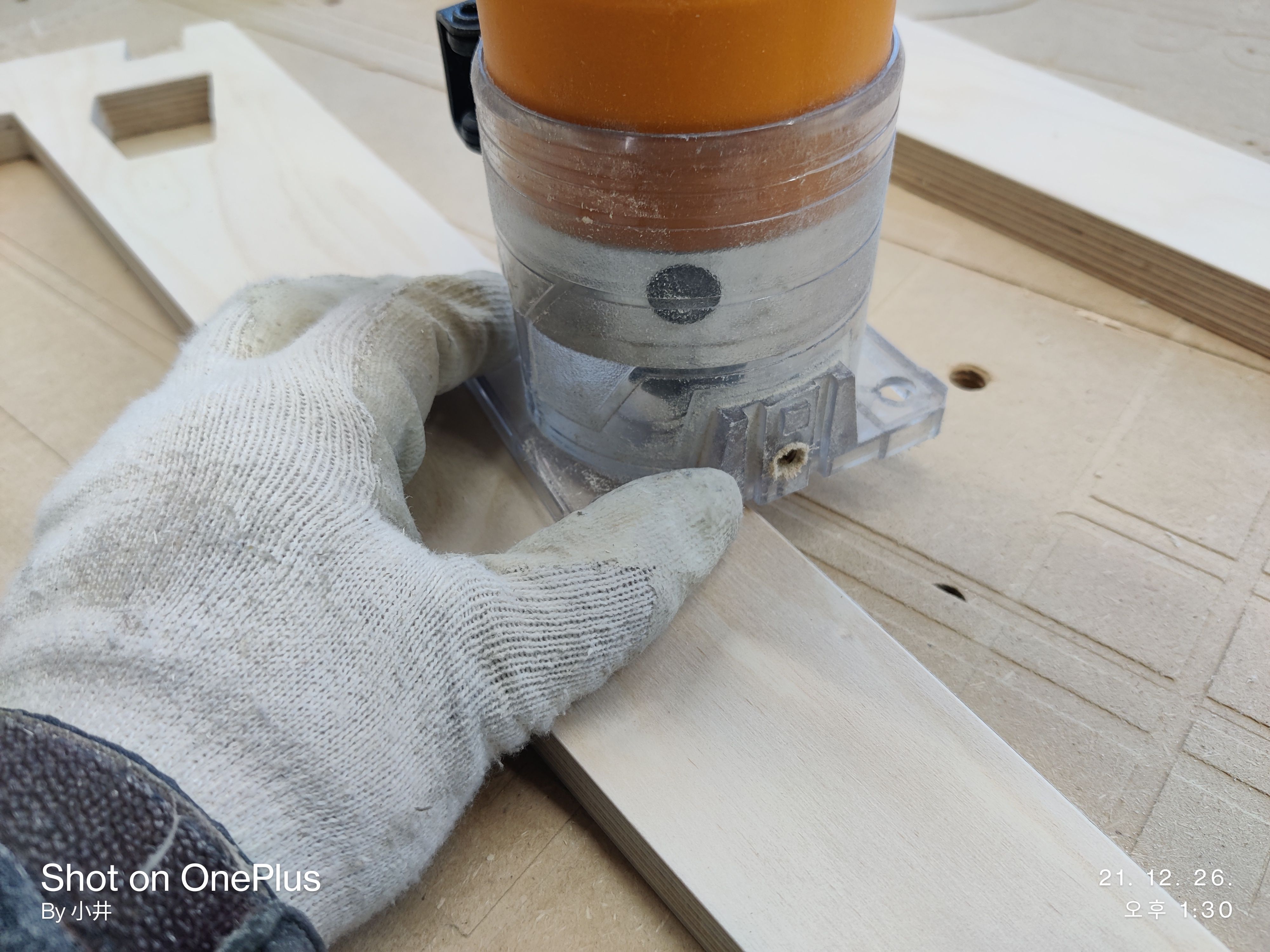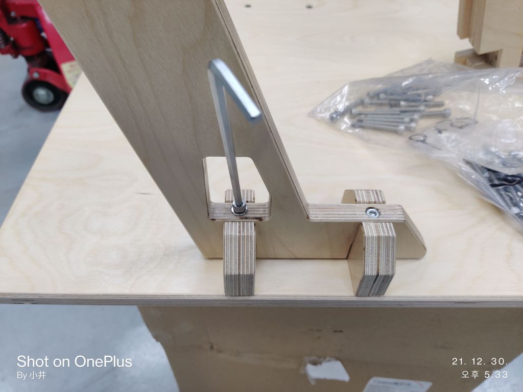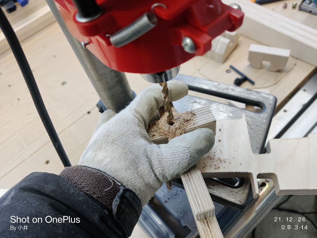 그리고 다리를 상판에 고정시킬 때 사용할 육각렌치 볼트를 넣을 구멍을 드릴링 머신으로 뚫어 주고