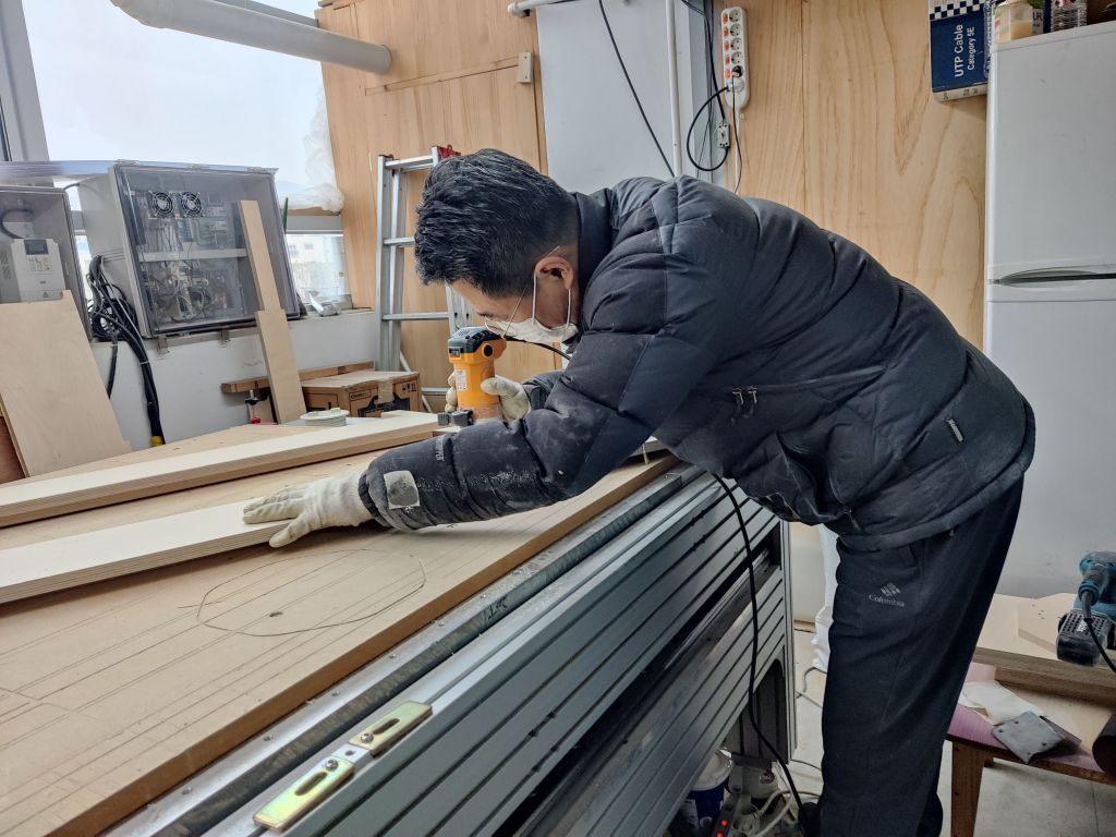각 합판을 본딩하여 양생한 부품의 각 엣지를 트리머를 이용하여