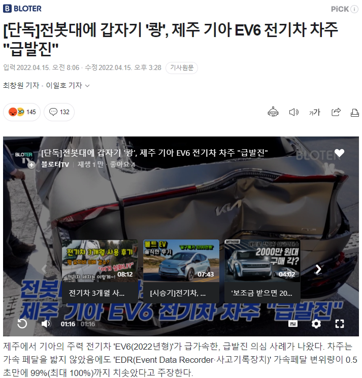 당연히(?) EDR 판독결과, 운전자가 브레이크와 악셀을 둘다 밟았다는 주장을 합니다..