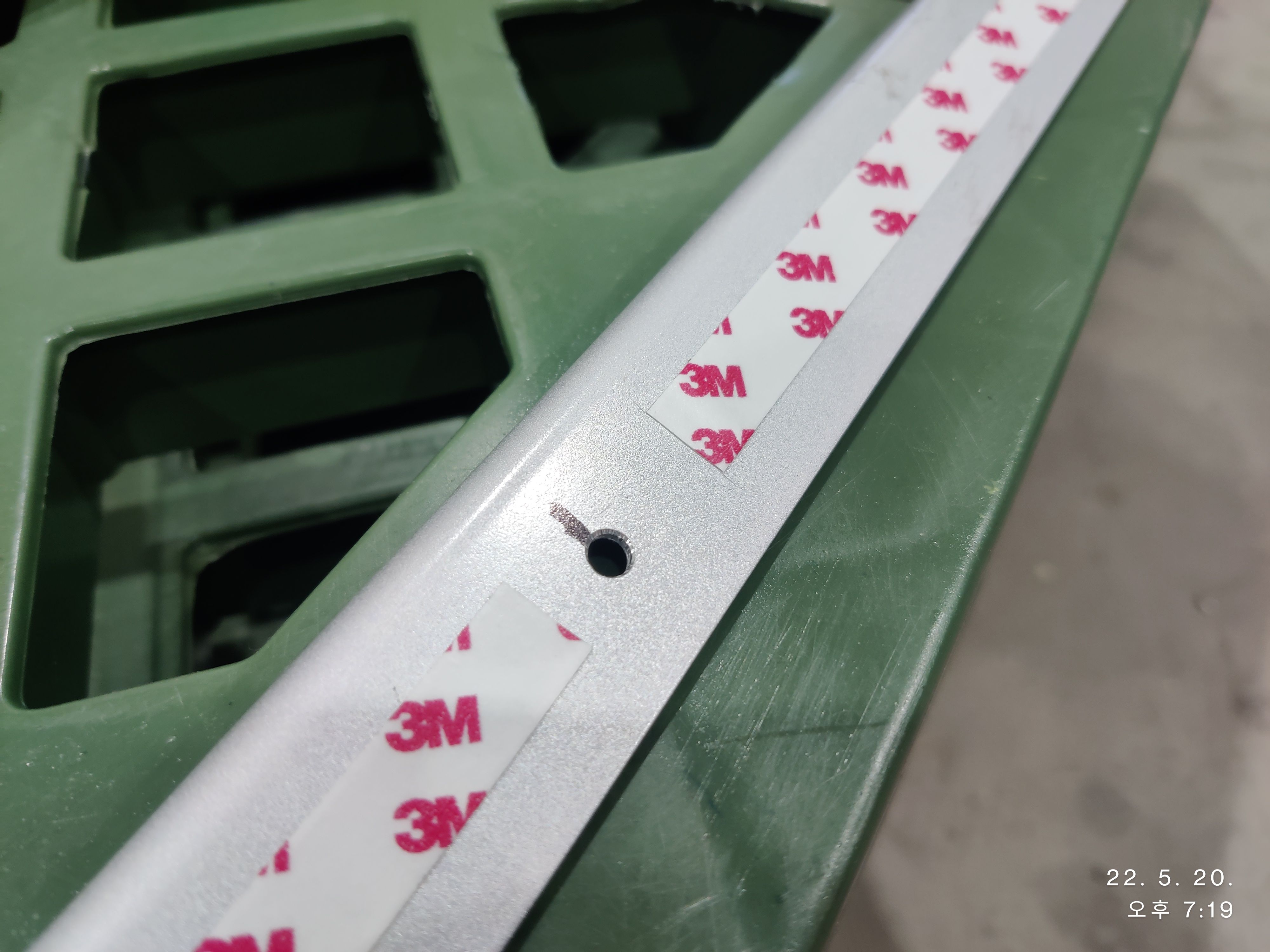 좀 저 정확히 원하는 위치에 구멍을 뚫고자 3mm 드릴로 작은 구멍을 뚫은 후 5mm로 뚫기로 했습니다.