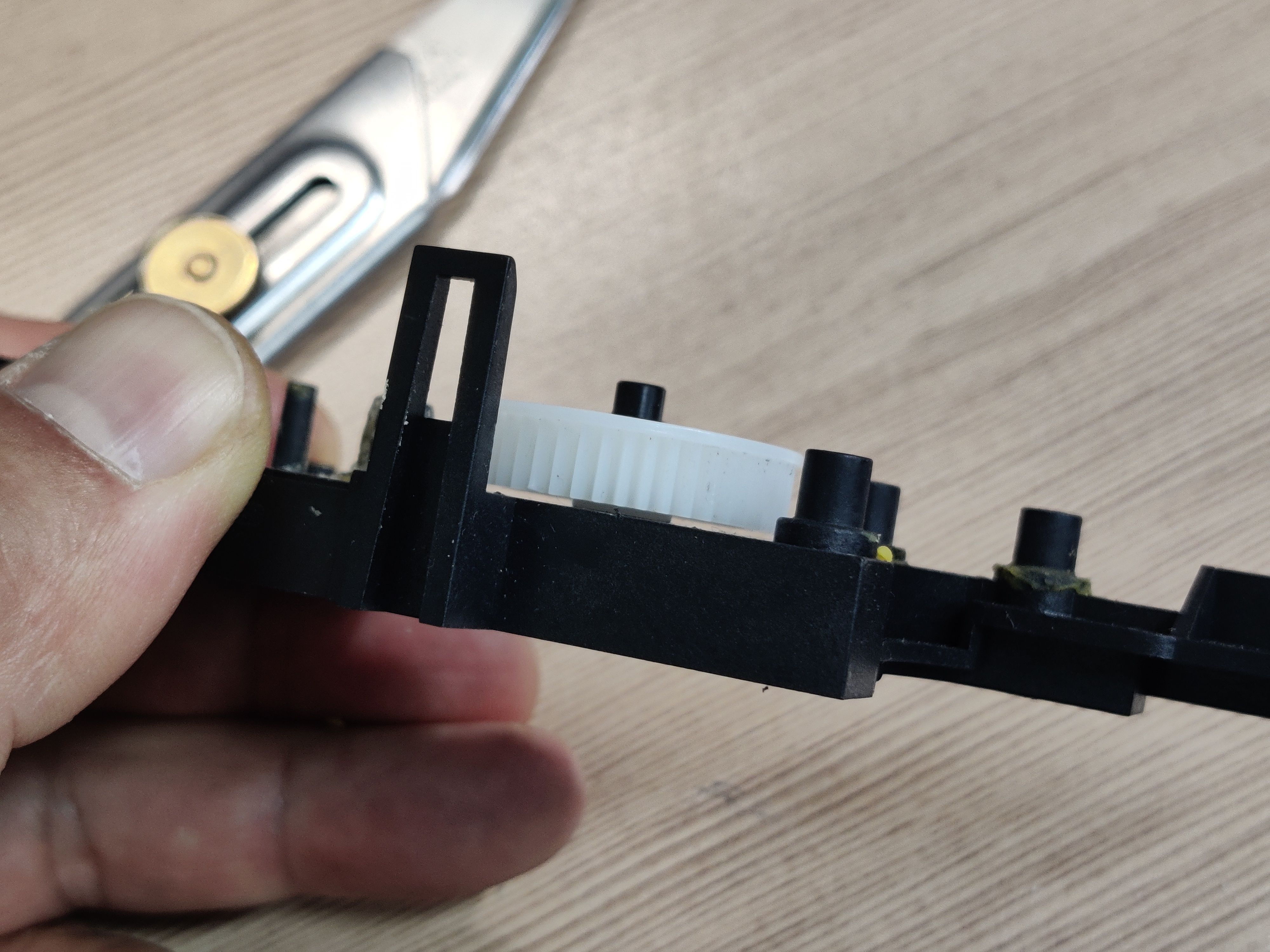 아래 사진의 하얀색 부품이 푸시너트의 일종으로 엔코더 필름이 이탈되지 않게 잡아 주고 있는거죠.