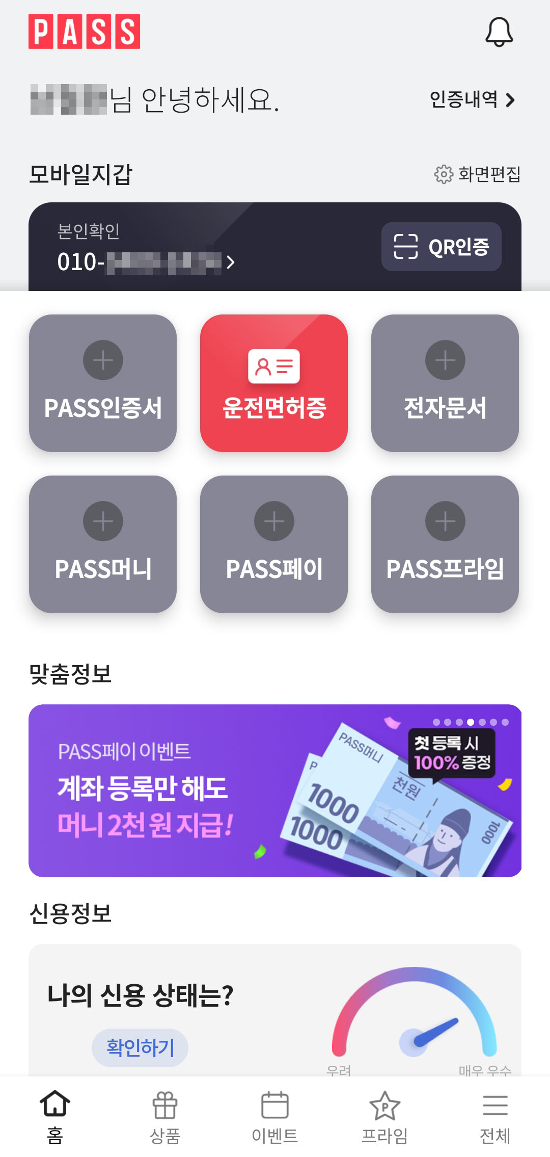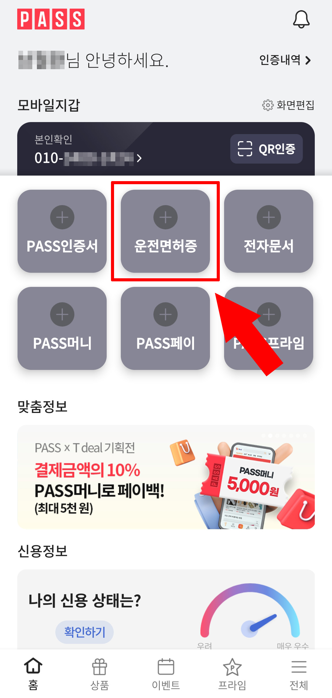 PASS앱 중앙의 운전면허증을 눌러 다음으로 진행하세요 ~