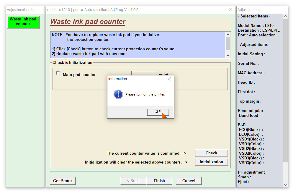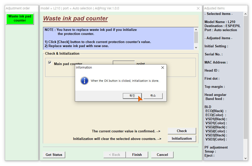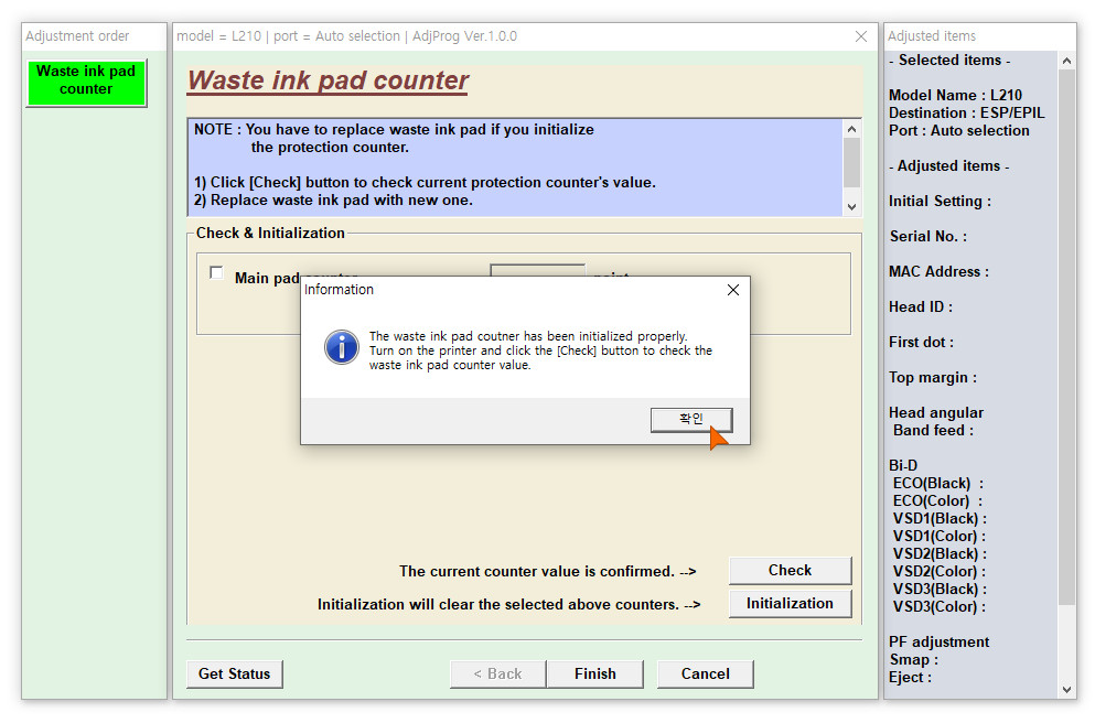 이윽고, 폐잉크 카운터가 올바르게 초기화가 되었다는 메세지를 만날 수 있습니다.