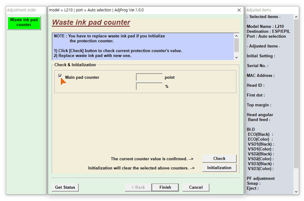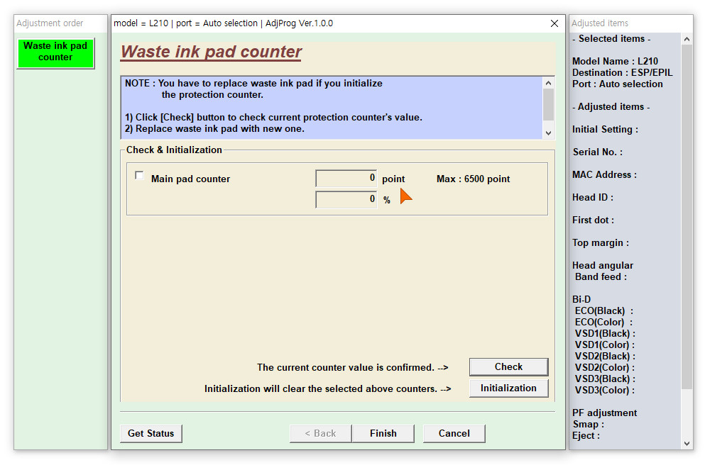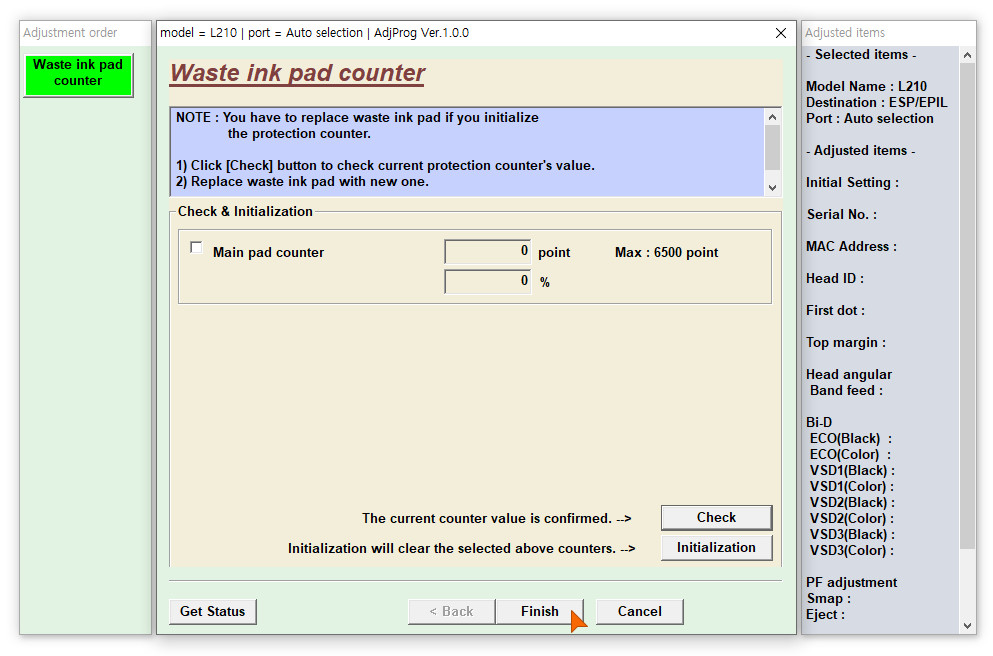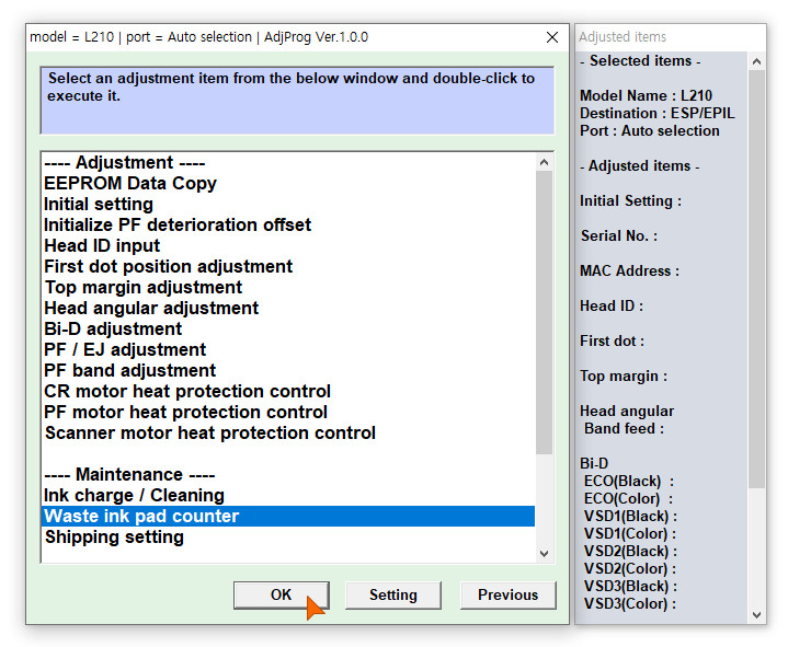 다시 Waste ink pad counter 를 선택한 후 OK 를 누릅니다.