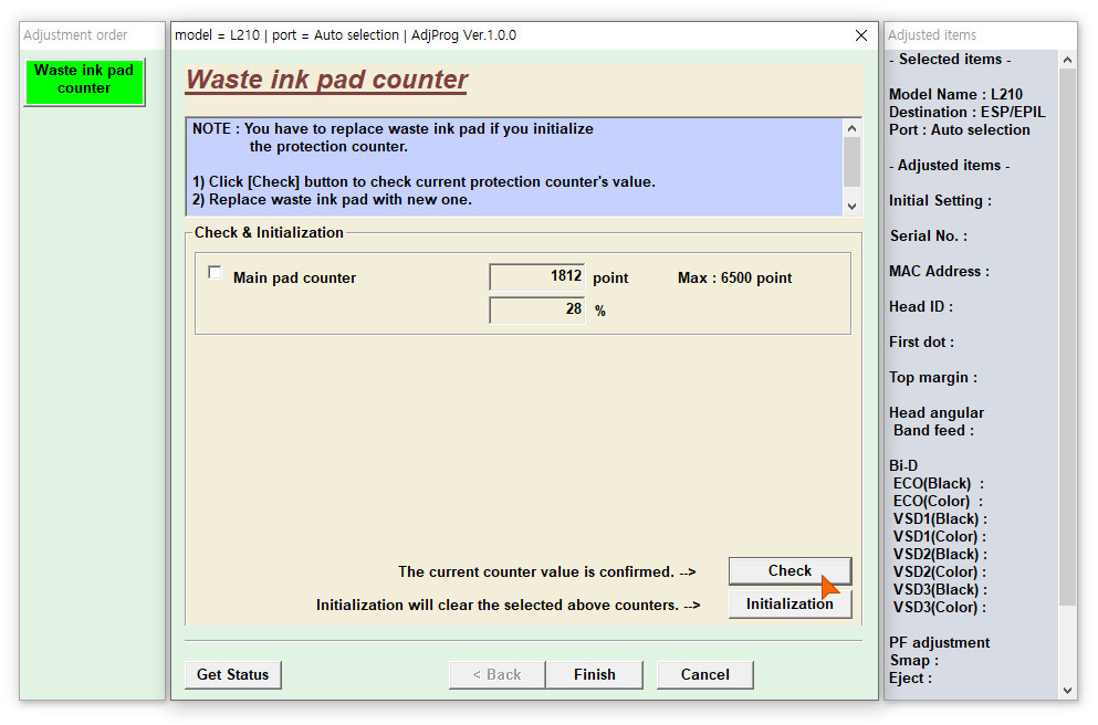 우측 하단의 Check 버튼을 누르면 현재 잉크패드 사용량을 확인해 볼 수 있습니다.