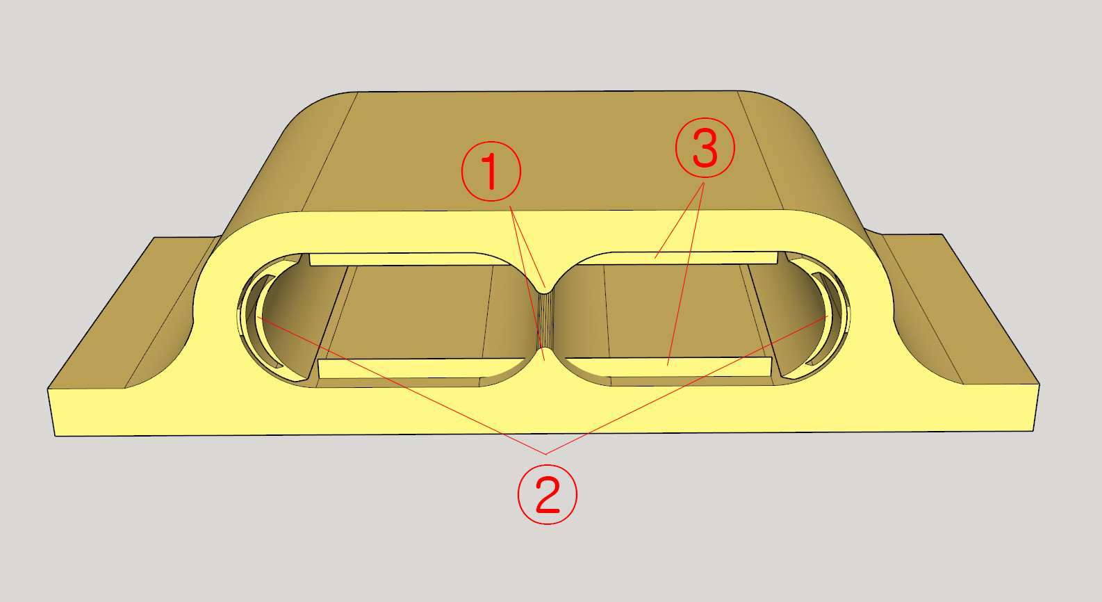 ② 번은 규격이 다른 두개의 호스의 폭이 다른 만큼, 작은 폭이나 큰 폭이냐에 따라 약간 유동적으로 좌우로 밀리는 텐션을 가진 부분으로, 각기 다른 규격에 따라 좌우를 잡아 주는 역할을 합니다.