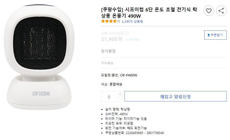 쿠팡이 수입하고 있으며, PTC 세라믹 히터를 이용하여 바로 바람이 나오는 온풍기 입니다.