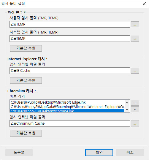 임시폴더 지정을 해주어야 윈도우가 임시 파일들을 만들 때