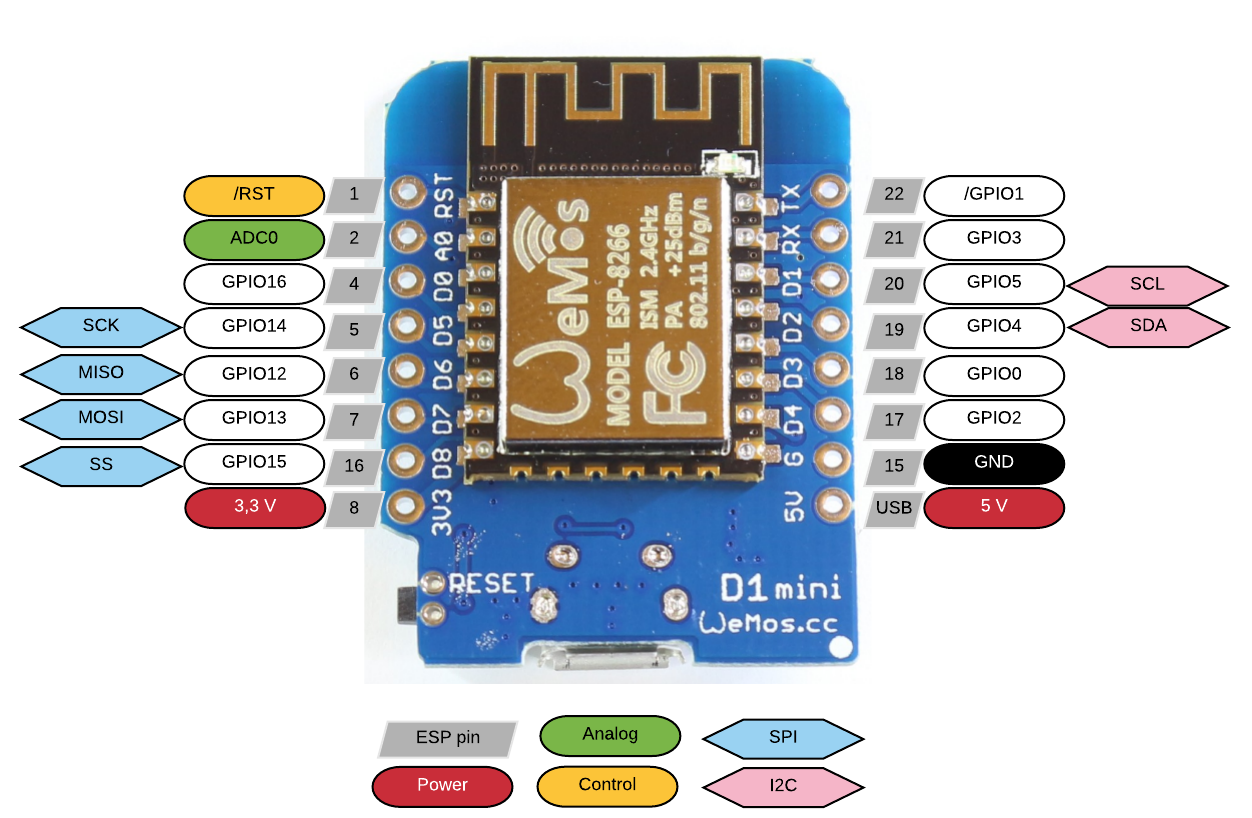 D1 mini는 11개의 디지털 입출력 핀이 있으며 인터럽트, PWM, i2C 그리고 1-wire 통신을 지원합니다.