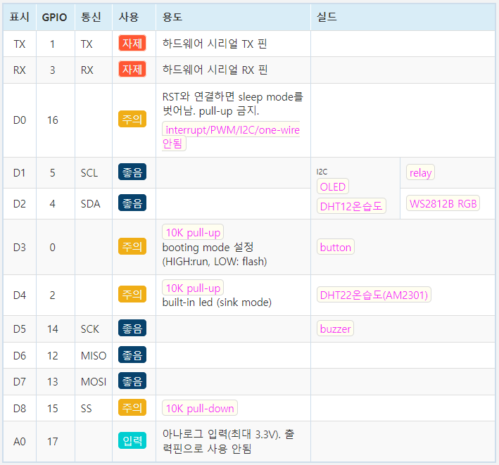 그리고 가장 중요한 부분이 D1 mini는 3.3v 기반 보드이기에 절대적으로 5V를 입력하면 보드가 사망할 수 있으니 주의해야 한다.