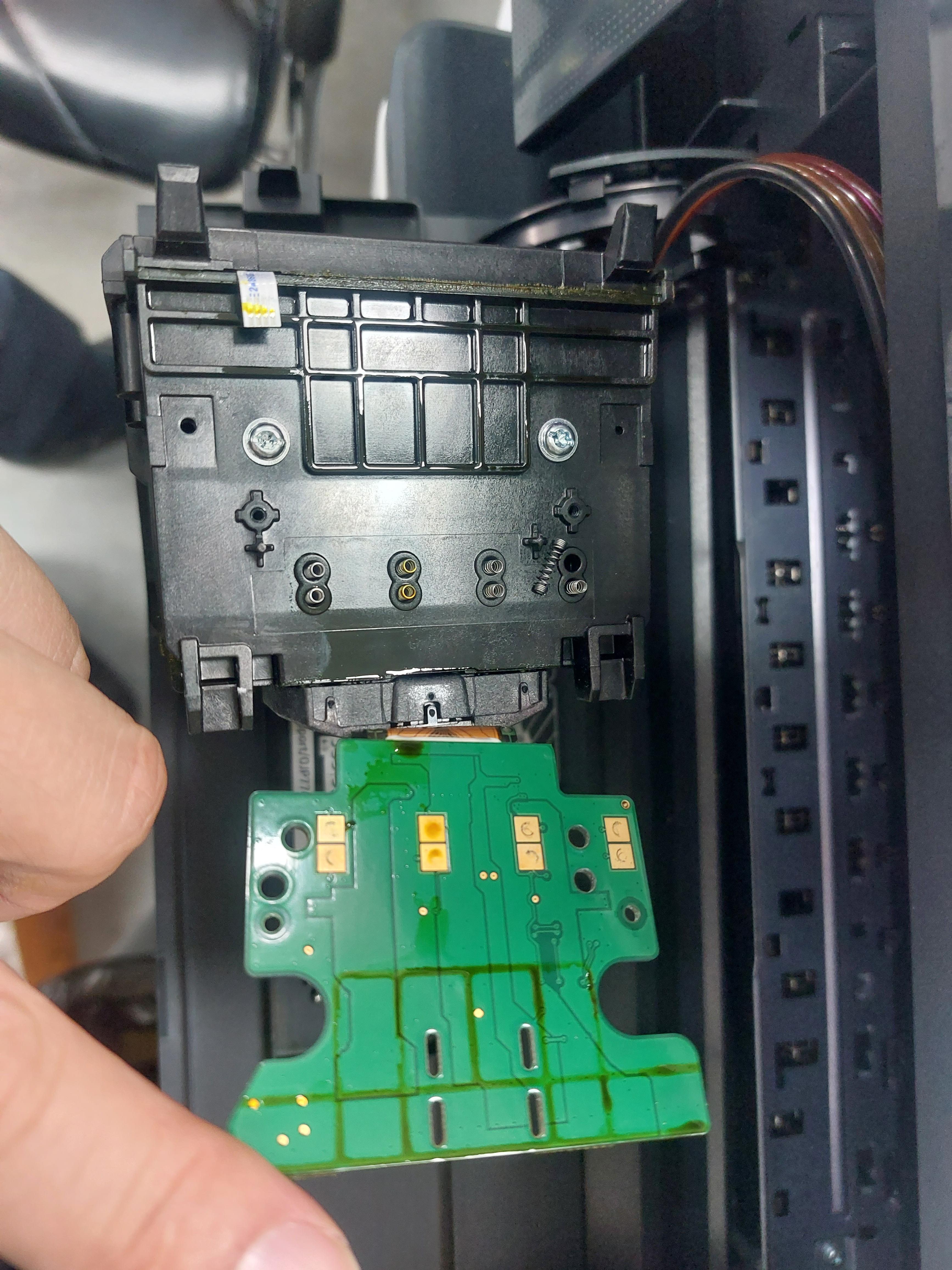 여기저기 보다 보니 헤드 후면부 PCB에 잉크 누수로 인한 쇼트가 발생한 것으로 보입니다.