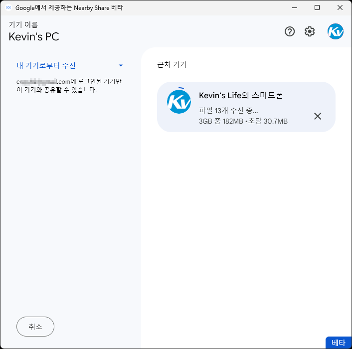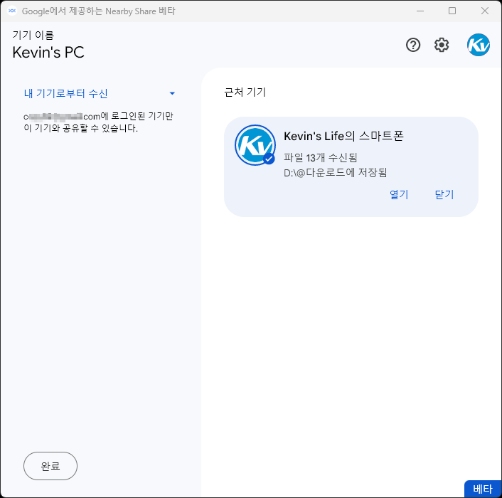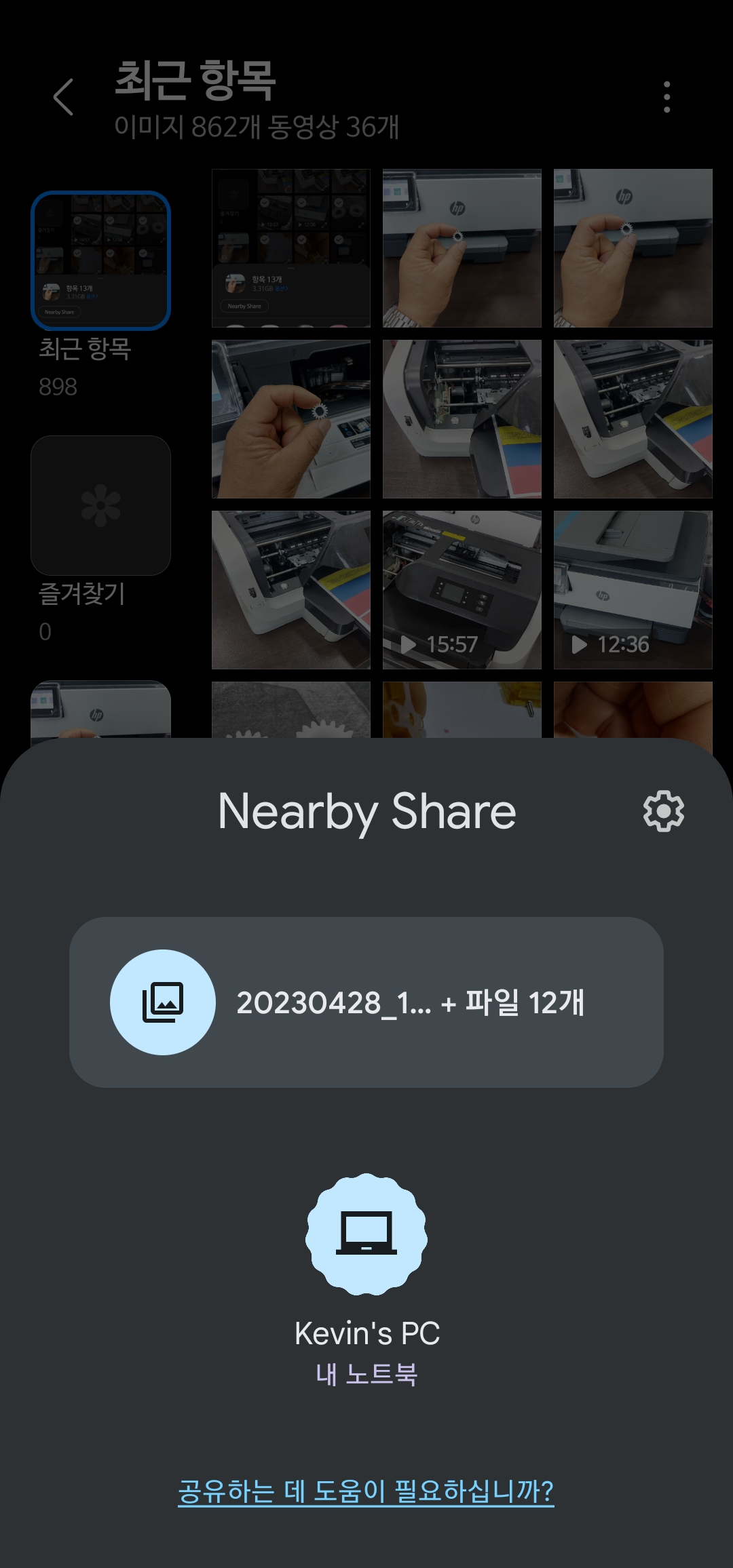 갤러리 앱에서 파일 선택 후 공유 버튼을 누르면 상단에 Near by share 라고 뜨고 그걸 누르면