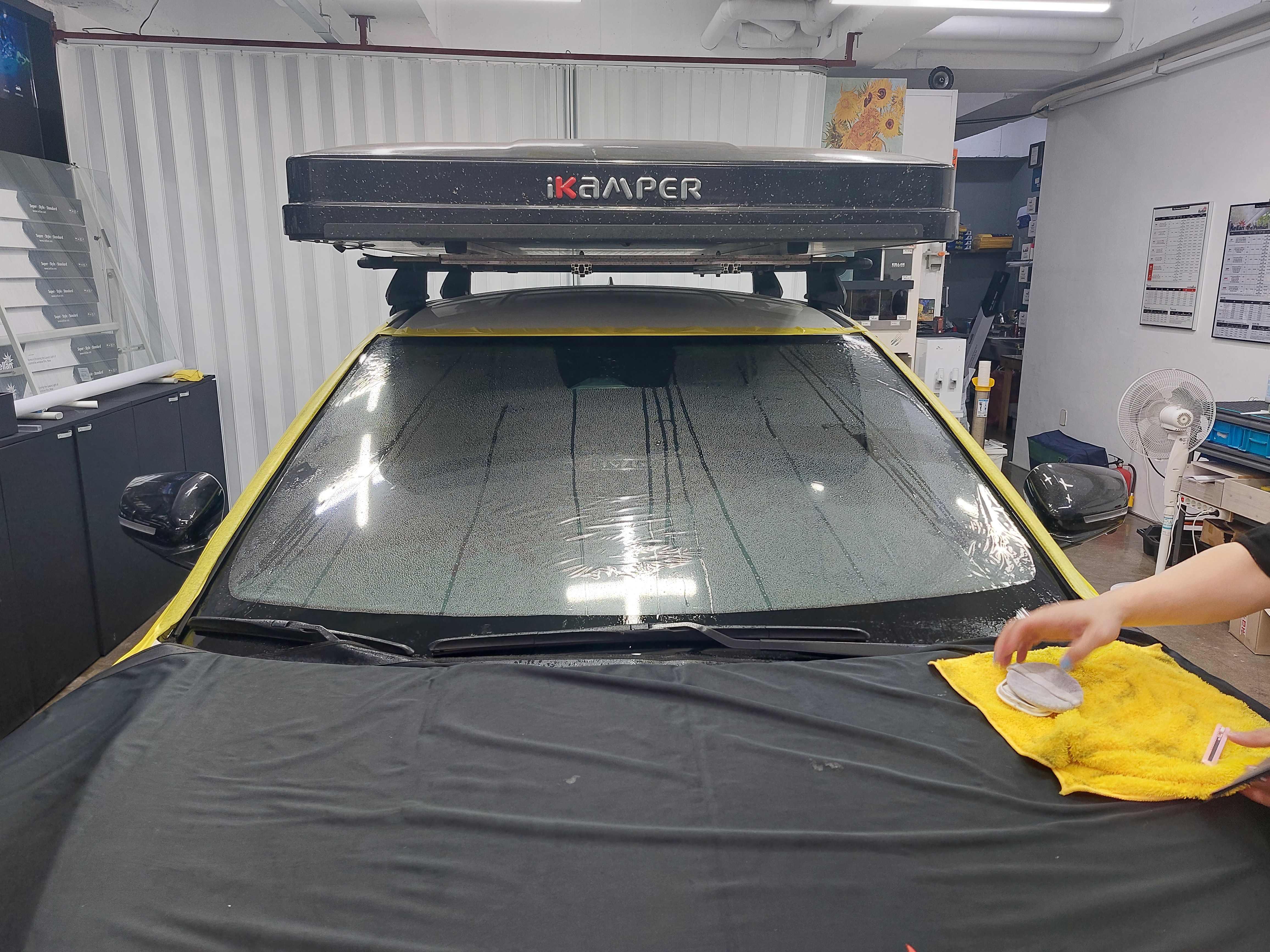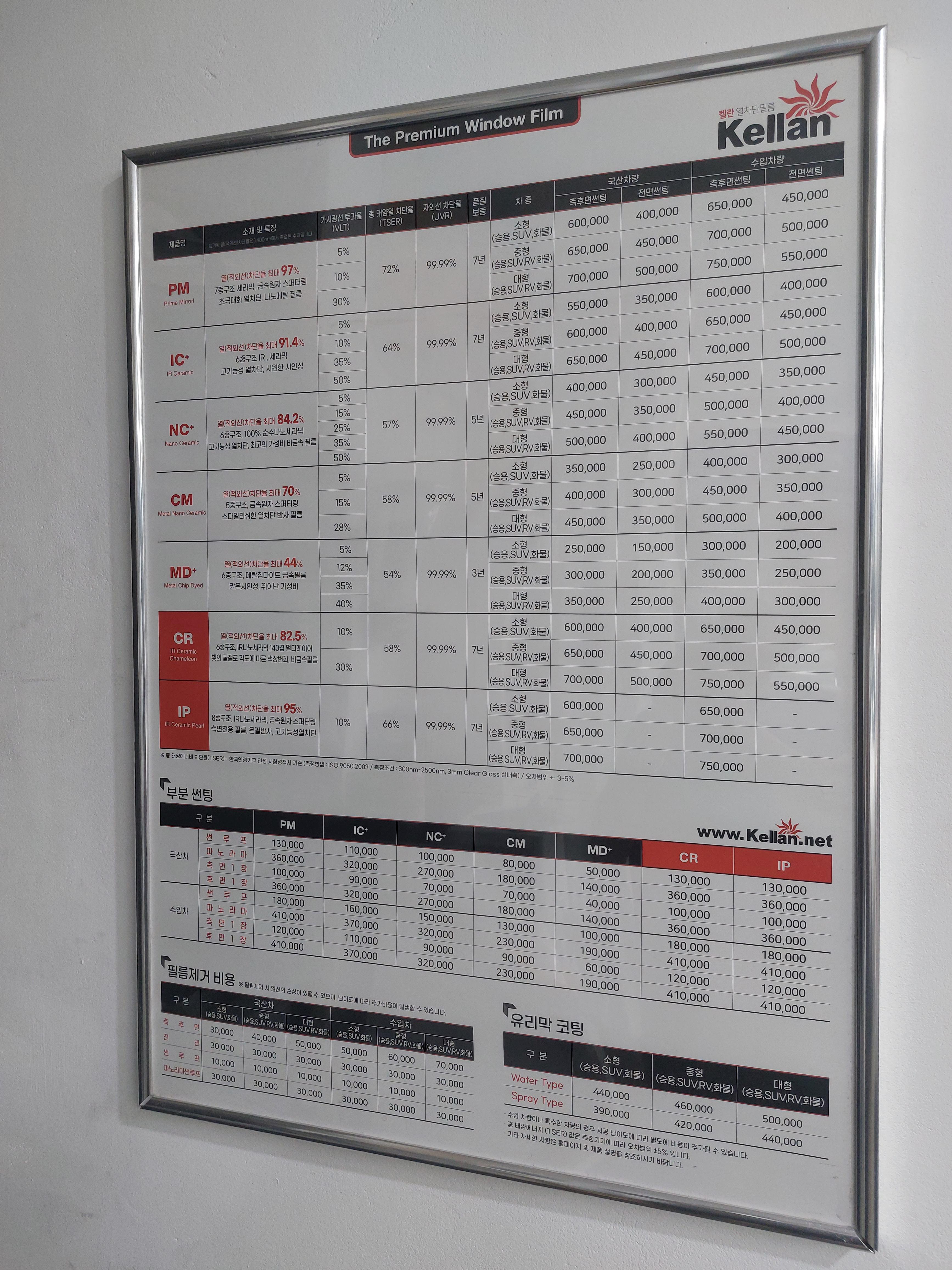 벽 한켠에 걸린 켈란 썬팅의 가격표.