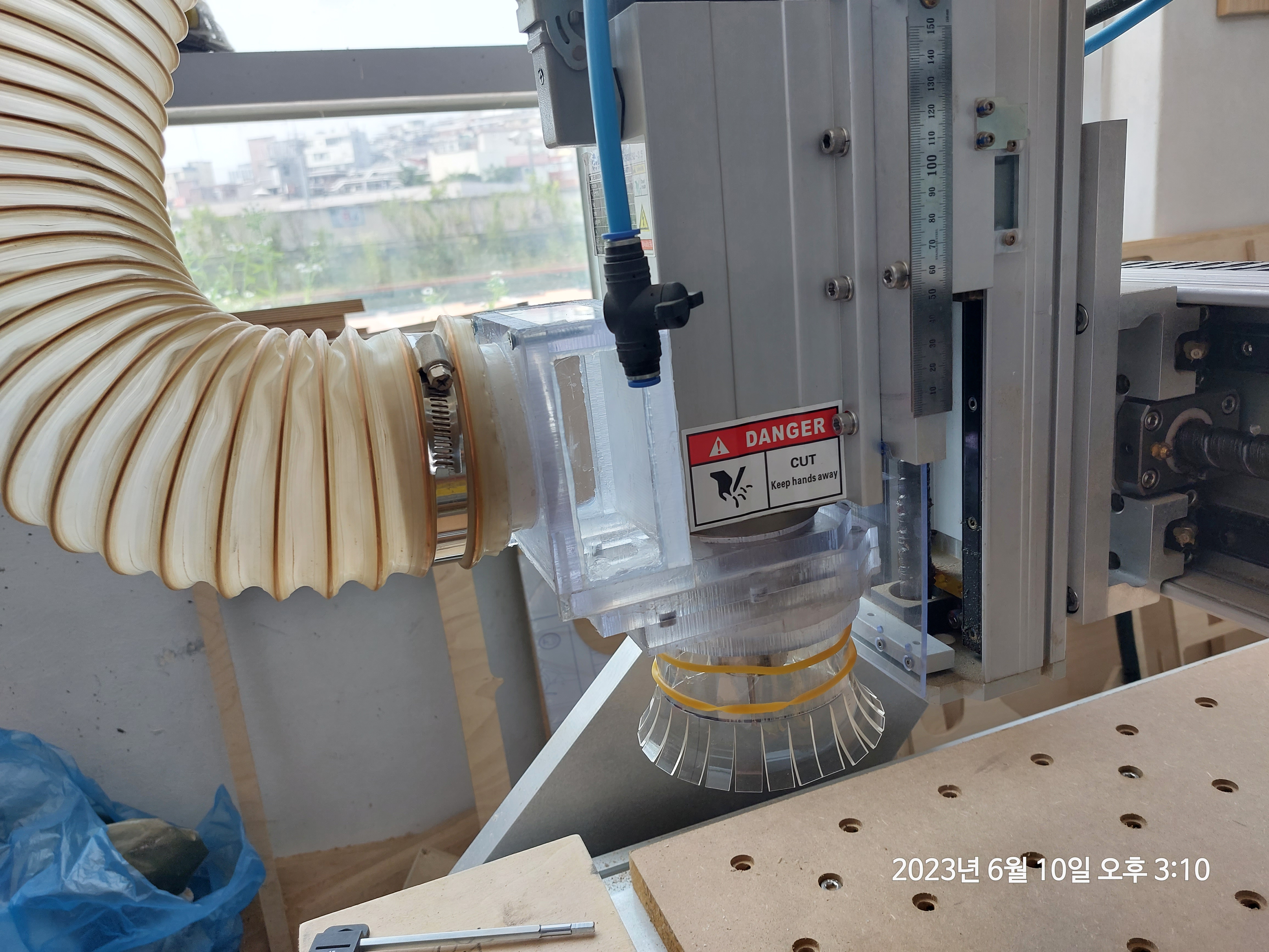 집진기 호스를 연결하고 고정까지 끝마친 상태입니다.