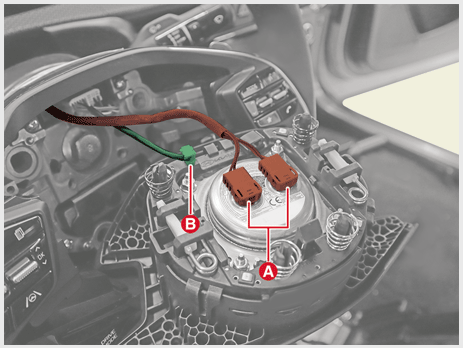 에어백 모듈 커넥터(A)와 혼 커넥터(B)를 분리하여 에어백 모듈을 탈거한다.