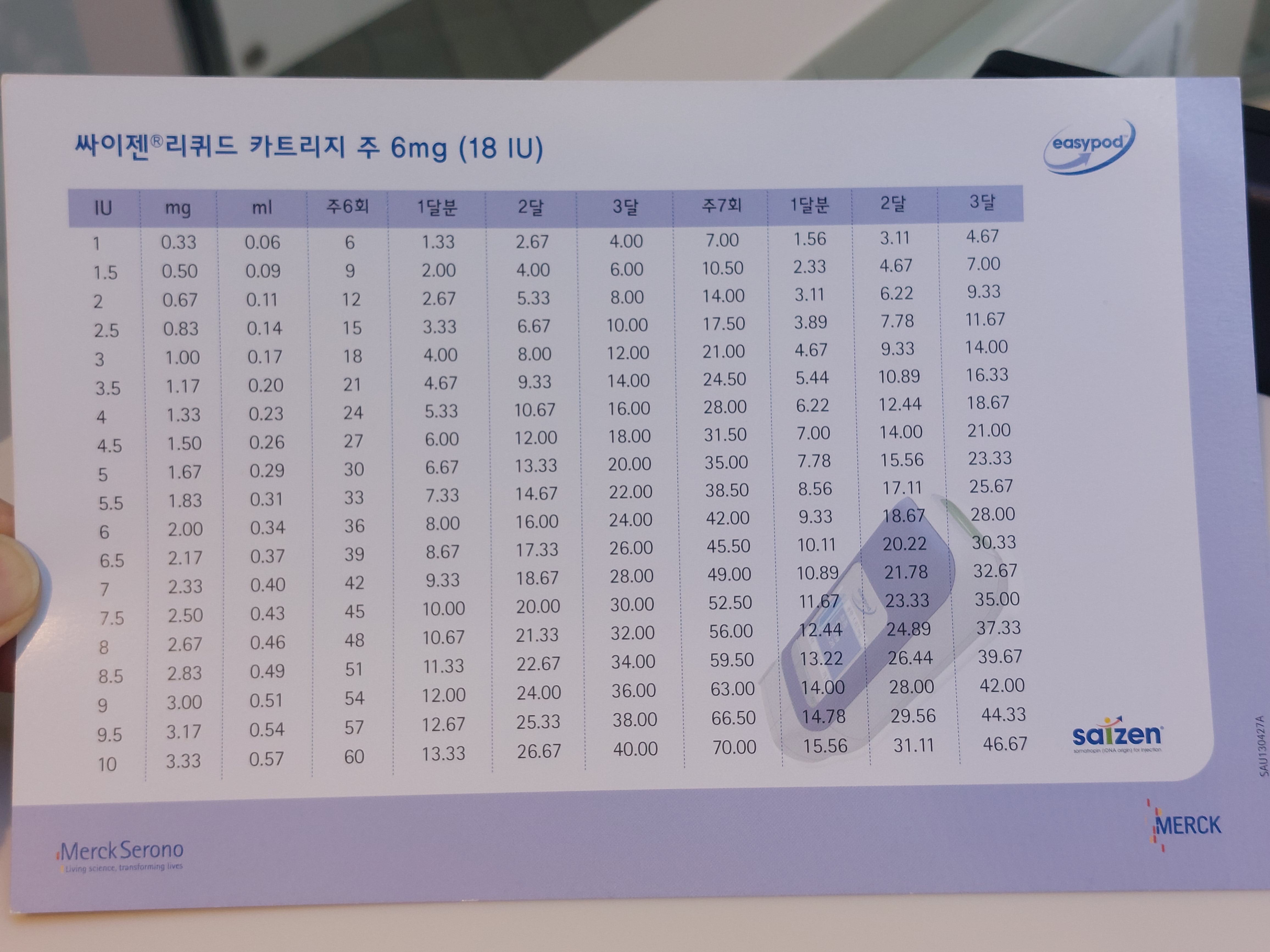주사용 카트리지 용량이 18 IU인 6mg짜리 기준의 환산표입니다.